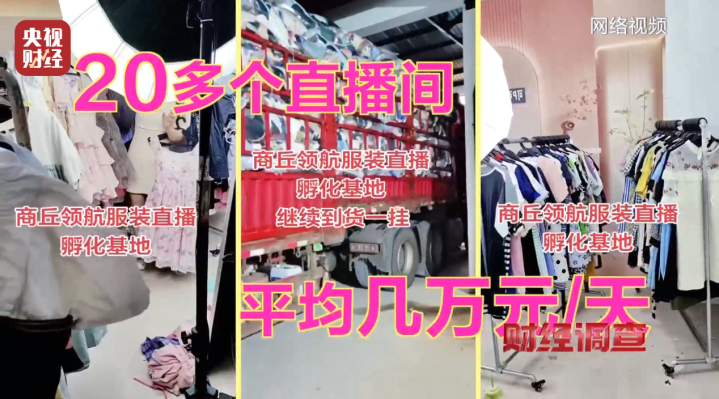 天和服饰老板告知记者,河南商丘直播基地是其最大客户,记者循线索前往调查。进入商丘领航直播基地,发现整层楼是大型二手衣物仓库,衣架挂满各式二手服装,角落堆着装满衣服的麻袋。